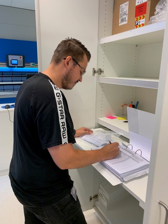 “Op het moment dat we een levering binnen krijgen, pakken wij de doos uit volgens protocol. We noteren op de bijgeleverde pakbon wanneer de doos is ontvangen, of er een temperatuurlogger bij zat en of de medicatie onbeschadigd is aangekomen. Als alles in orde is gaat de medicatie onder de juiste temperatuur omstandigheden in quarantaine, zoals we dat dan noemen. Op dat moment kan de medicatie nog niet worden gebruikt. Vóórdat de medicatie uit quarantaine kan, moeten we eerst de medicatie beschikbaar stellen. Ook dat doen we aan de hand van een protocol. Bij het beschikbaar stellen controleren we of alle gegevens van de pakbon overeenkomen met de ontvangen medicatie en controleren we of alle goedkeuringsdocumenten aanwezig zijn. Indien deze documenten niet aanwezig zijn vraag ik deze op bij de betreffende sponsor. Pas als alle documentatie en gegevens kloppen halen we de medicatie uit quarantaine en zetten dit onder juiste temperatuur omstandigheden op een voorraad locatie. Nu kunnen ze gebruikt worden wanneer dit nodig is. Zoals je leest wordt alle medicatie voor onderzoek heel goed geregistreerd en gecontroleerd, alles moet namelijk herleidbaar zijn.”