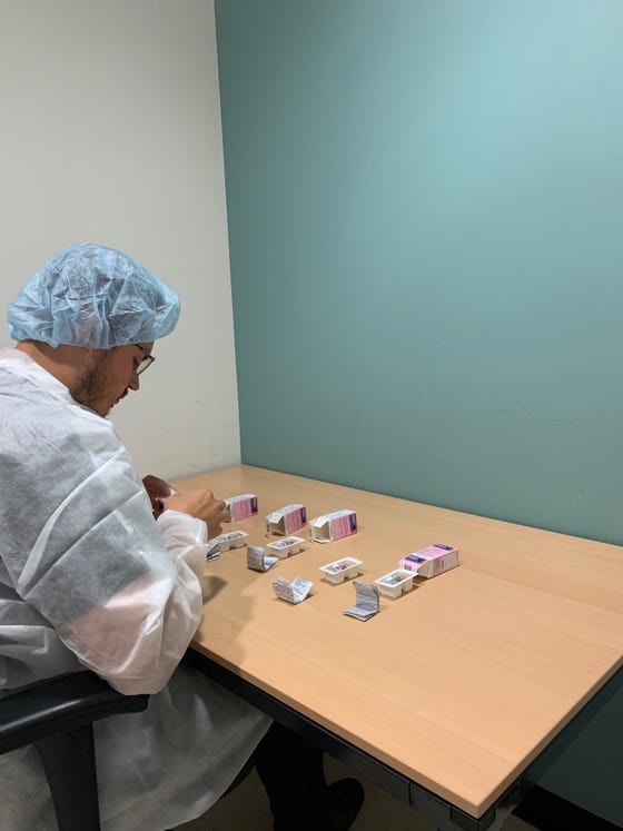 Het uitpakken van de medicatie is een secuur werk dat volgens protocollen wordt gedaan.